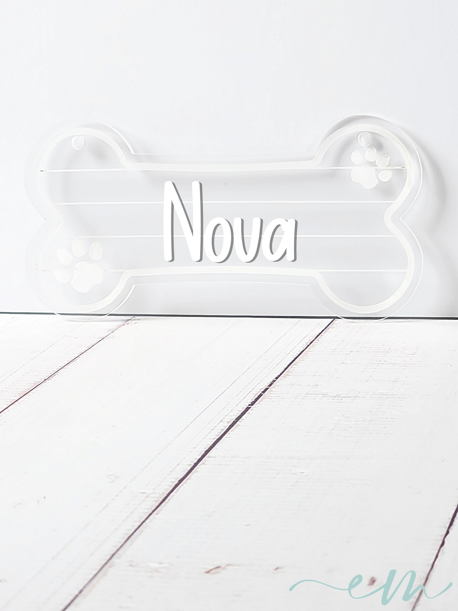 Add a unique and personal touch to your dog’s kennel, house, or wall décor with this custom clear acrylic dog bone nameplate. Each sign features engraved paw print details and lets you choose one outline style — shiplap, cut-out, or bold outline.